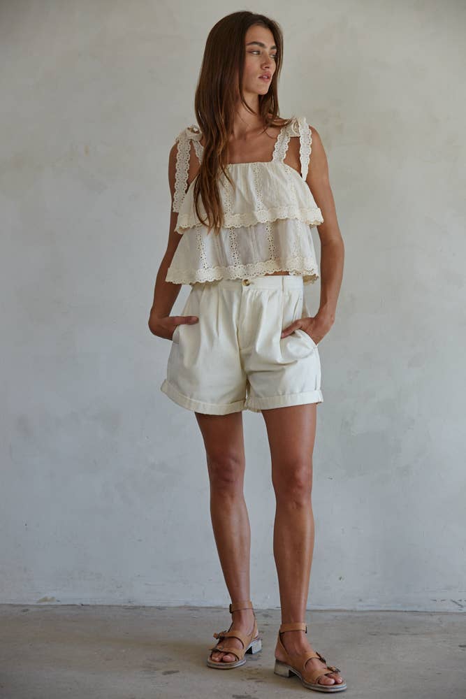 Woven Cotton Embroidered Eyelet Layered Square Neck Shoulder Tie Strap Top With Lace Trim Detail